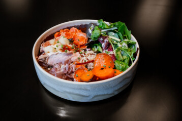 gratinated goat’s cheese, pickled Baltic salmon, Mecklenburg cole slaw