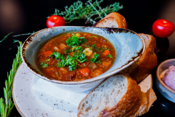 Rustic tomato soup with grissini and olive oil